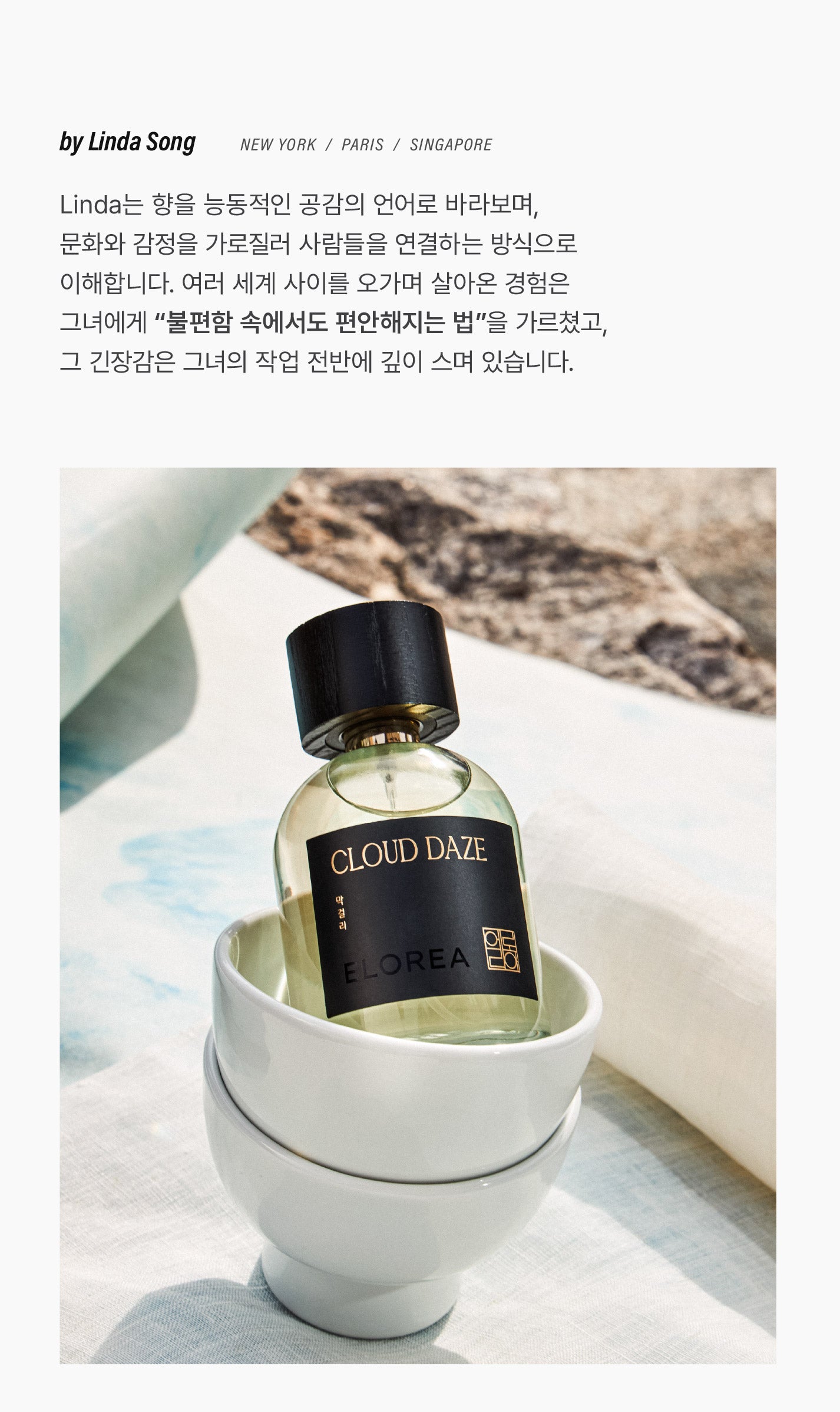 상큼한 주니퍼와 레몬, 아미리스의 부드러움이 더해져 산뜻하게 시작되어,막걸리와 코냑이 조화를 이루며 은은하고 깊이 있는 매력을 더합니다. 마무리로는 갓지어진 밥의 달큰함과 바닐라, 달고나가 부드럽게 녹아들 듯 이어집니다. 달콤하지만 과하지 않고, 은근하게 여운을 남기는 향이 피부 위에 잔잔히 머물며 균형 잡힌 우아함을 선사합니다.