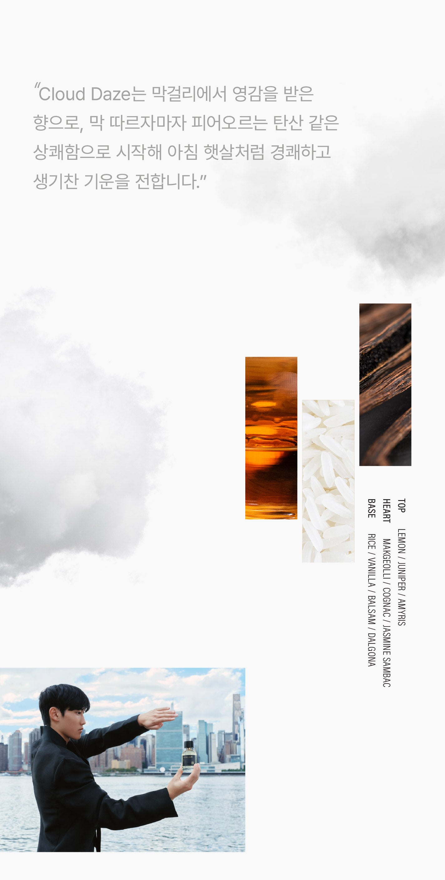 Cloud Daze; 막걸리는 부드럽고 은근한 달콤함이 매력적인 향으로, 우리나라 전통주에서 영감을 받았습니다. 가볍고 크리미한 질감 속에 달달한 산미가 어우러져, 익숙하면서도 포근하고 중독적인 무드를 완성합니다.