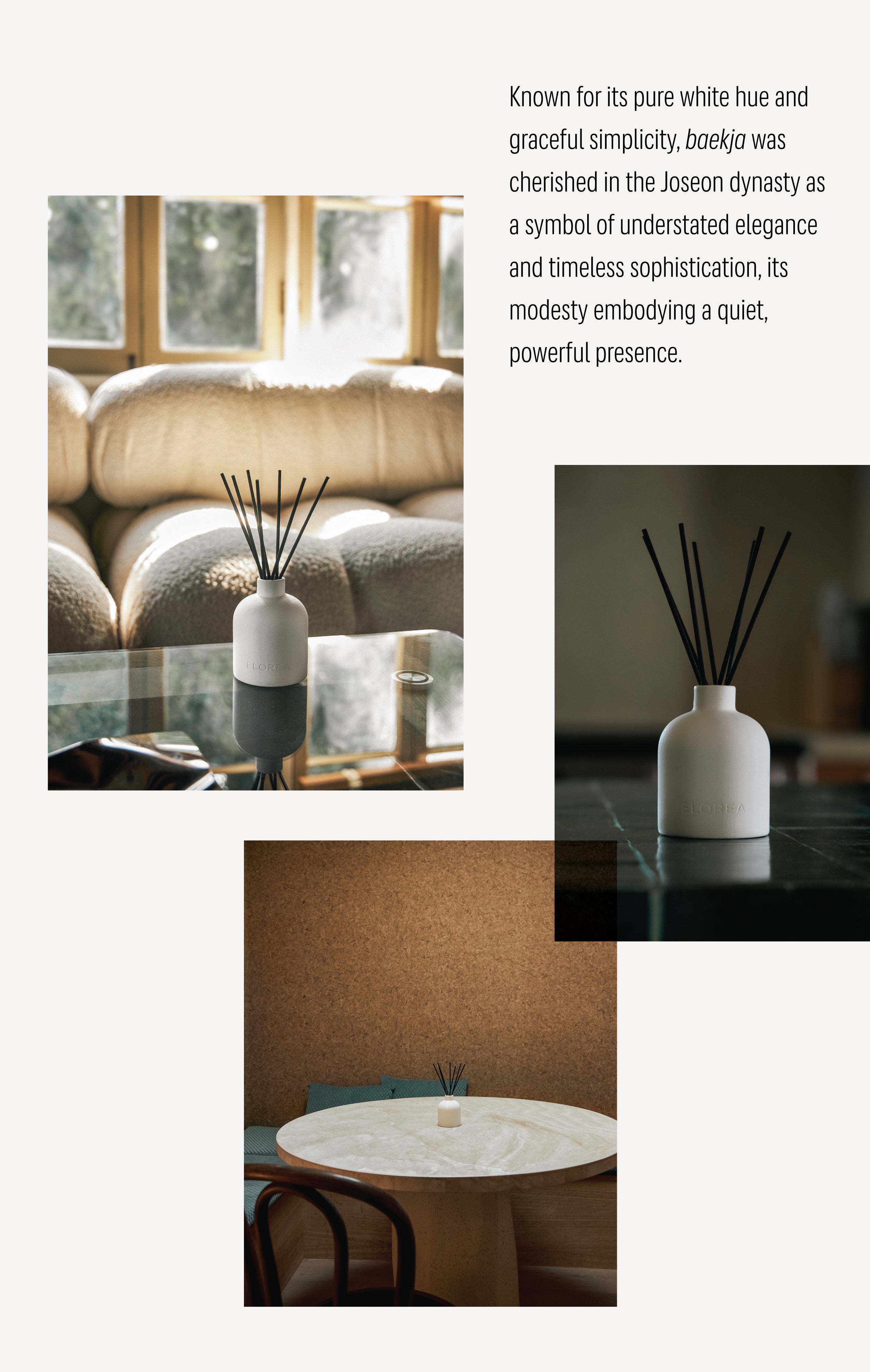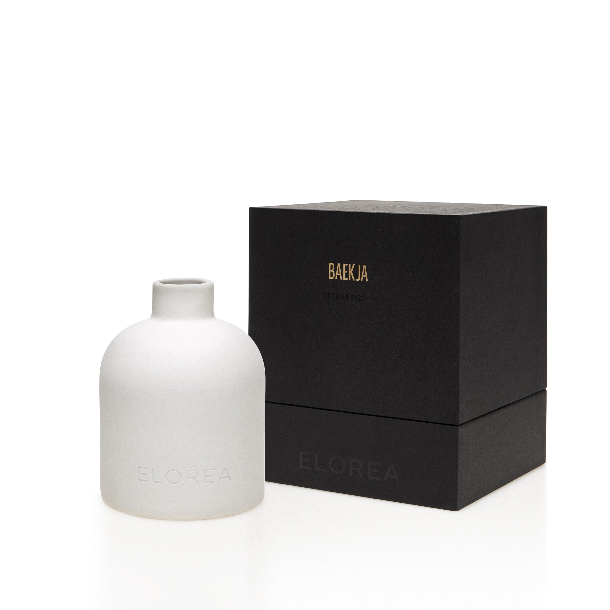 'BAEKJA' celebrates its understated beauty and minimalism. The vessel blends tradition with modern deign. Crafted in white porcelain and shaped like ELOREA's iconic bottle, it embodies the refined simplicity of baekja, adding timeless sophistication to any space.